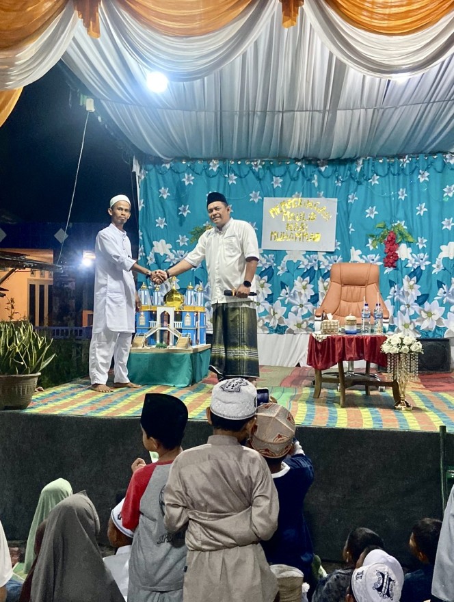 Peringatan Maulid Nabi Muhammad SAW di Dusun Jati dan Dusun Kenari pada 2 Oktober 2025 berlangsung khidmat sekaligus berkesan. Salah satu momen menarik terjadi saat Kades Bogak, Fazzary Akbar SE, membeli miniatur masjid karya Firdaus, pemuda Dusun Jati. Miniatur bercorak Melayu itu dipajang di panggung utama dan langsung memikat perhatian warga.