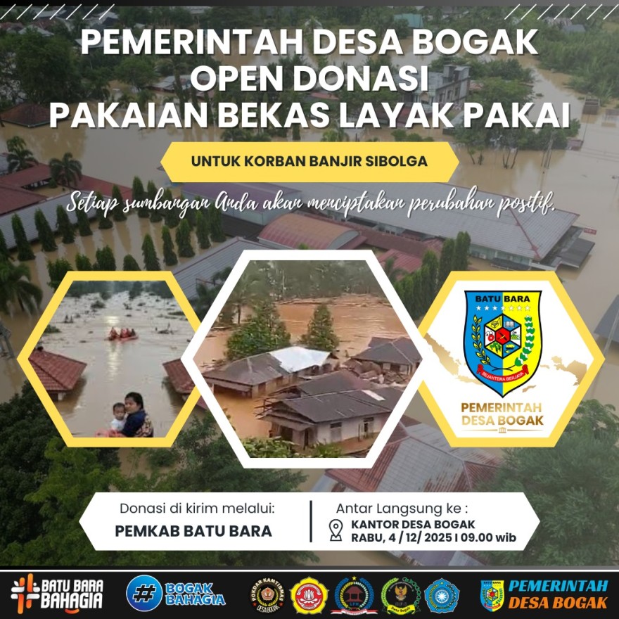 Ayo, Seluruh warga Bogak mari kita bantu saudara-saudara kita di Sibolga dan Aceh yang terkena banjir dengan donasi pakaian bekas layak pakai! Setiap sumbangan, sekecil apapun, akan sangat berarti bagi mereka yang membutuhkan. Kita bisa menyalurkan donasi melalui Pemerintahan Desa Bogak atau organisasi yang terpercaya